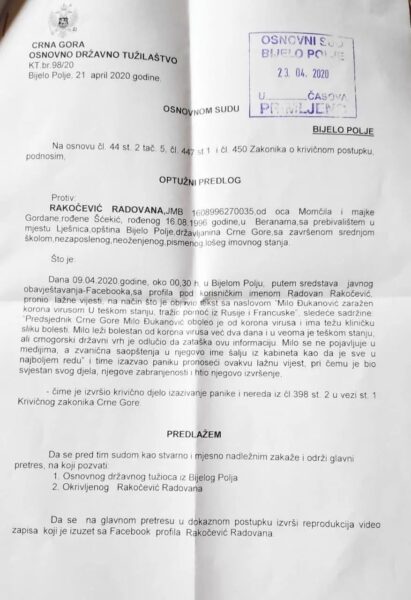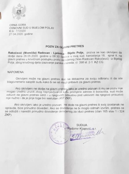 Демократски фронт обавјештава јавност да је Радовану Ракочевићу, члану ГО ДНП- а из Бијелог Поља од стране судије Радомира Кљајевића, уручен позив да се 26. маја појави на главном претресу у поступку који се води против њега јер је на свом ФБ профилу пренио вијест једног српског портала да је Мило Ђукановић инфициран корона