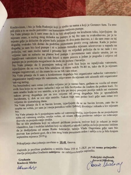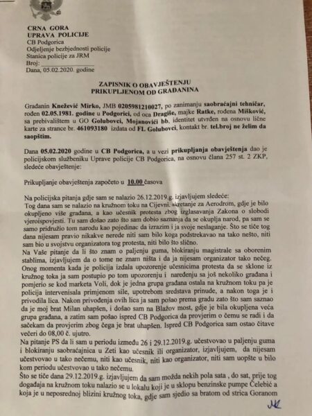 Демократски фронт обавјештава јавност да је данас у Центру безбједности Подгорица, у својству грађанина, ради прикупљања информација, саслушан Мирко Кнежевић, брат Милана Кнежевића, а на околности сукоба једног броја грађана Зете са припадницима САЈ – а од 29.децембра. Како би на сваки начин елиминисали спинове одређених режимских портала који покушавају оправдати бруталну полицијску акцију у породичном дому Кнежевића, али и хапшење Ратке Кнежевић, Миланове и Миркове мајке, овим путем интегрално објављујемо Записник о обавјештењу прикупљеном од Мирка Кнежевића.