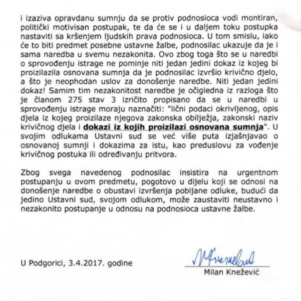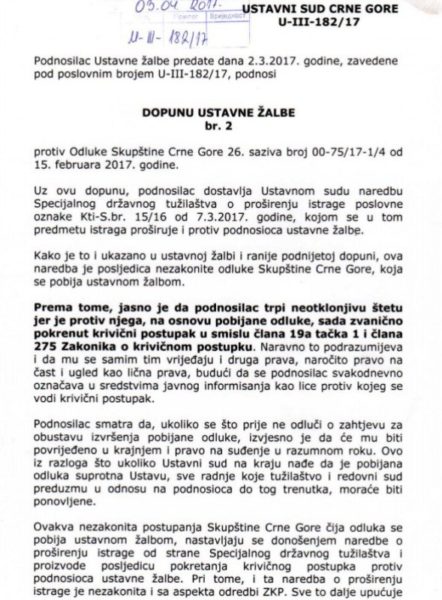Demokratska narodna partija Crne Gore obavještava javnost da je njen predsjednik Milan Knežević, Ustavnom sudu podnio Dopunu ustavne žalbe protiv odluke Skupštine Crne Gore o ukidanju imuniteta.